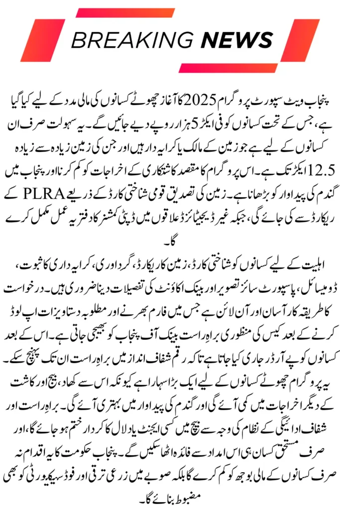 The Punjab Wheat Support Program 2025 is a great opportunity for small farmers, offering them financial assistance of Rs. 5,000 per acre. This initiative will not only reduce the cost of fertilizer, seeds and cultivation but will also increase wheat production and ensure food security. Direct and transparent payment through Bank of Punjab will relieve the farmers of financial burden. This program is an important step towards prosperity for farmers and agricultural development in Punjab.